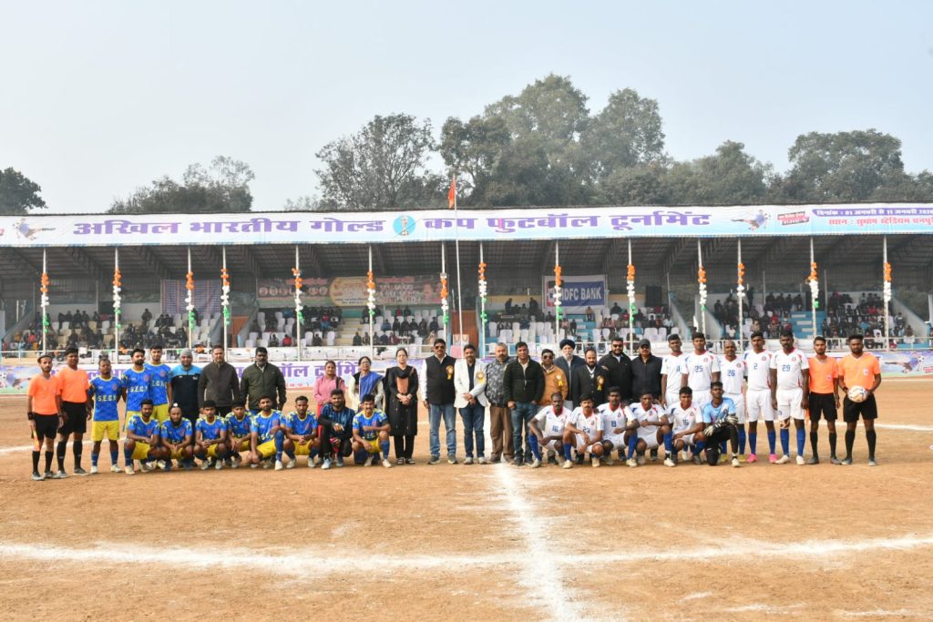 धनपुरी।नगर पालिका परिषद धनपुरी के तत्वावधान में आयोजित अखिल भारतीय गोल्ड कप फुटबॉल टूर्नामेंट–2026 में शुक्रवार 03 जनवरी 2026 को सुभाष स्टेडियम धनपुरी क्रमांक-3 में फुटबॉल प्रेमियों को रोमांच और जुनून से भर देने वाले मुकाबले देखने को मिले।