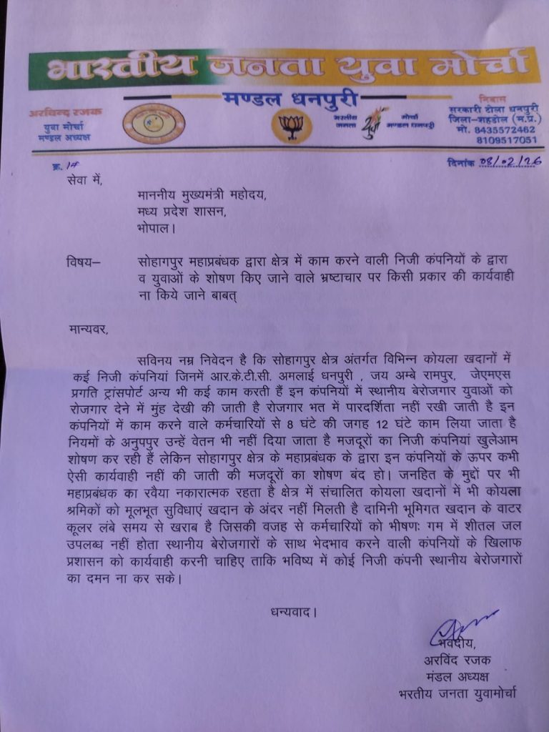 युवा मोर्चा मंडल अध्यक्ष अरविंद रजक द्वारा सौंपे गए पत्र में उल्लेख किया गया है कि सोहागपुर क्षेत्र अंतर्गत संचालित विभिन्न कोयला खदानों में कई निजी कंपनियां—जिनमें आर.के.टी.सी., अमलाई धनपुरी, जय अंबे रामपुर और प्रगति ट्रांसपोर्ट सहित अन्य संस्थाएं कार्यरत हैं—स्थानीय बेरोजगार युवाओं की अनदेखी कर बाहरी श्रमिकों को प्राथमिकता दे रही हैं। पत्र में आरोप लगाया गया है कि रोजगार उपलब्ध कराने में पारदर्शिता का अभाव है तथा स्थानीय युवाओं को अवसरों से वंचित किया जा रहा है।