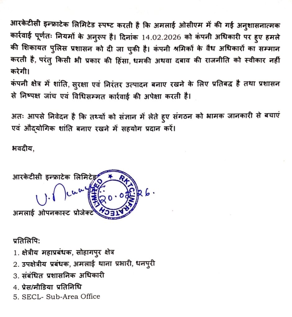 अमलाई ओसीएम परियोजना में उठे विवाद के बीच आरकेटीसी इनफ्राटेक लिमिटेड ने तथ्यों के साथ अपना पक्ष सामने रखते हुए स्पष्ट किया है कि की गई प्रत्येक अनुशासनात्मक कार्रवाई सेवा नियमों और स्थापित प्रक्रियाओं के अनुरूप है। कंपनी ने दो टूक कहा है कि श्रमिकों के वैध अधिकारों का सम्मान उसकी प्रतिबद्धता है, लेकिन कार्यस्थल पर अनुशासनहीनता, हिंसा और दबाव की राजनीति किसी भी सूरत में स्वीकार्य नहीं होगी। औद्योगिक शांति, सुरक्षा और निरंतर उत्पादन को सर्वोच्च प्राथमिकता बताते हुए प्रबंधन ने निष्पक्ष जांच और तथ्यात्मक संवाद की आवश्यकता पर जोर दिया है।